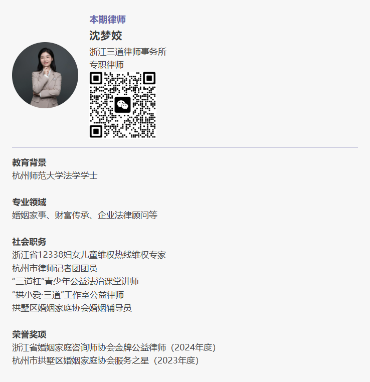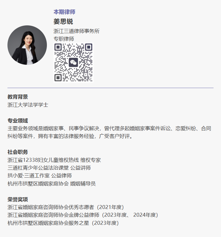 沈梦姣律师、姜思锐律师获评“金牌公益律师”,充分展现了三道律师在婚姻家庭法律服务领域的卓越表现与公益奉献。